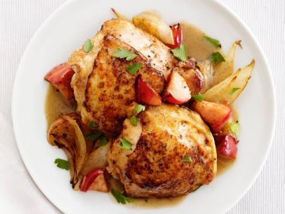 Add the onion and apples to the skillet and season with salt and pepper. Cook until slightly softened, about 4 minutes. Mix the broth with the mustard, then add to the skillet and bring to a boil. Arrange the chicken, skin-side up, in the skillet. Transfer to the oven and roast until the chicken is cooked through, 15 to 20 minutes.
