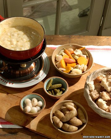 - Boiled fingerling potatoes, sausages, beef tips, cornichons, or pickled vegetables, for serving (optional)