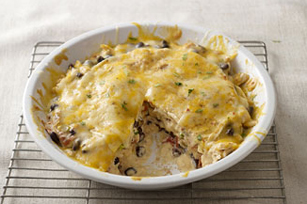 SPOON 1/3 of the chicken mixture into 9-inch pie plate; top with 1 tortilla, half the remaining chicken mixture and 1/4 cup shredded cheese. Cover with second tortilla, remaining chicken mixture, 1/4 cup shredded cheese and remaining tortilla. Top with remaining cooking creme and shredded cheese; cover.