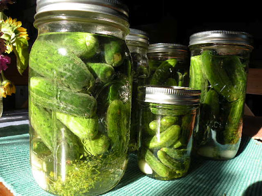 Put half of the dill and garlic in the bottom of the glass jar. Add cucumbers.