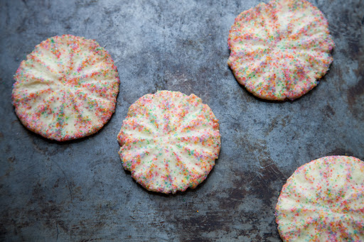 2. Use mounded teaspoonfuls and make balls of dough with your hands. Place on an ungreased cookie sheet, then flatten the dough with the bottom of a patterned glass dipped in colored sugar (don't mix the red and green!).