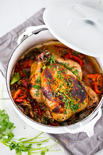 Marinate chicken for at least 1 hour at room temp…. or up to 24 hours refrigerated. Make marinade: Zest orange and lime and set aside. Add juice from lime and orange ( should be at least a ½ cup total ) and garlic to a blender. Add oil, salt, pepper, cumin. Blend well. Rinse and truss chicken and place in large Ziploc bag, with the marinade, turning to coat all the nooks and crannies. Let sit at room temp for one hour, turning occasionally. (Or marinate up to 24 hours in the refrigerator). In a large dutch oven, heat 1-2 T oil over medium heat. Add the onion "rings", sauté on med high heat, stirring often until golden and just tender about 4-5 minutes. Add peppers, turn heat to med, sauté 3-4 more minutes. Add the wine, half of the orange and lime zest, the bay leaves and turn heat off. Remove chicken from marinade and set it aside on a plate or on parchment paper. Pour all remaining marinade into the pot with the onions and peppers, and give a sir. Nestle the trussed chicken breast side DOWN in the pot. Place on the lower rack of a 425 F oven for 20 minutes. Turn chicken over, reduce heat to 400, and continue to roast until inner thigh reaches 165 F -about 35-45 minutes more.