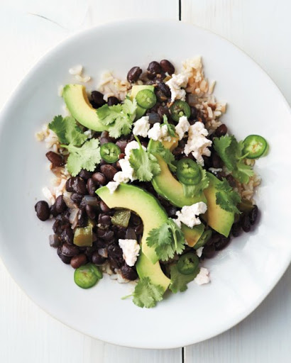 Hearty and healthy, black beans, brown rice and avocado makes a quick dinner or lunch.