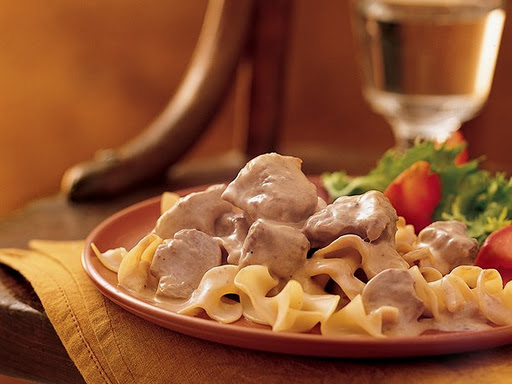 - 1/2 pound beef stew meat 1/4 cup chopped onion 1 can (10 3/4 ounces) condensed cream of golden mushroom soup 1 jar (2 1/2 ounces) Green Giant® sliced mushrooms, drained 1/8 teaspoon pepper 1/2 cup sour cream 1 1/2 cups hot cooked noodles or rice