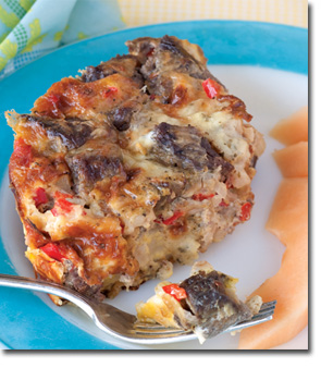 Bake casserole for 1 hour and 10 to 20 minutes or until eggs are set in center, covering with aluminum foil, if necessary, to prevent excess browning. Let stand for 10 minutes before serving.