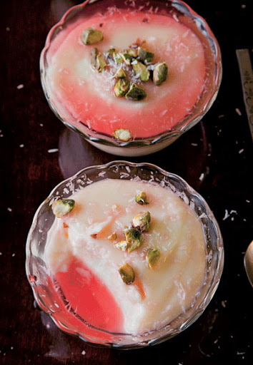 Meanwhile, bring the remaining sugar and 1/4 cup of water to a boil in a 1-qt. saucepan. Stir in the remaining rose water and the food coloring to make a syrup. To serve malabi, top each pudding with the rose water syrup, the pistachios, and the coconut.