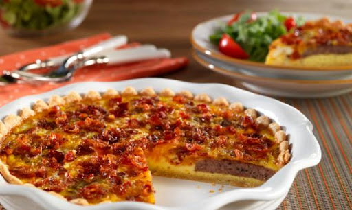 HEAT sausage patties according to package directions and place on the bottom of prebaked pie shell. Top with shredded cheese and half the bacon.
