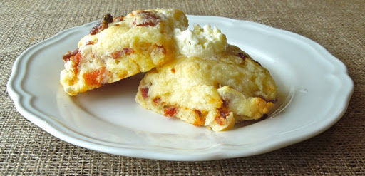 Measure flour into a large mixing bowl, and whisk to fluff it a bit. Add your cold butter and shortening, and cut it into the flour with a pastry blender, until pea-sized pieces form. Make a well in the flour mixture, and add your buttermilk. I usually add 3/4 cup at first, and add more if I need it. Mix the dough lightly with a fork. The dough will be sticky. If it is too dry, add a little more buttermilk. When it looks like it is just about to come together, dump in the candied bacon pieces and mix in.