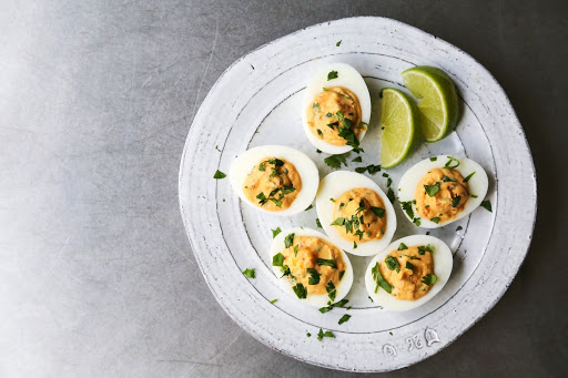 Transfer yolk mixture to a small zip top bag. Seal the bag, then cut off one of the bottom tips. Pipe the yolk mixture into the wells of each egg white. Sprinkle with additional chopped cilantro.