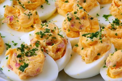 Peel the hard-cooked eggs, and cut in half lengthwise. Remove yolks to a small bowl. Mash egg yolks with mayonnaise, crumbled bacon and cheese. Stir in mustard. Fill egg white halves with the yolk mixture and refrigerate until serving.