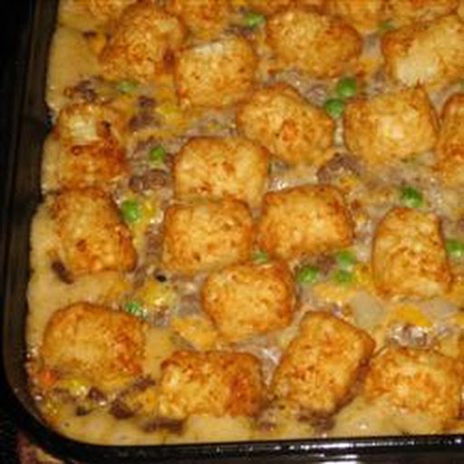 Brown hamburger and onion, drain and stir in the soup, milk, veggies and cheese. Season with salt and pepper. Place in a 2 qt. casserole and top with frozen tater tots.