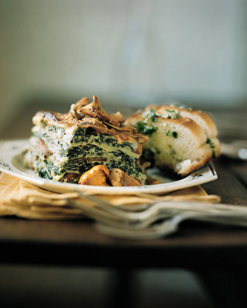 Heat oven to 350 degrees. Set aside 1/2 cup sauce. Assemble lasagna: Spread 1/2 cup sauce in bottom of 9-by-13-inch baking pan. Place layer of lasagna sheets in pan, trimming to fit; spread 1 cup spinach mixture, 1 cup mushroom mixture, and 1/2 cup sauce on top of lasagna sheets. Repeat layers several times. For last layer, place a layer of lasagna sheets on top; spread 1/2 cup sauce over lasagna sheets. Sprinkle with 1/2 cup grated cheese. Bake lasagna until top is golden brown, 1 to 1 1/4 hours. Let stand 20 minutes before serving.
