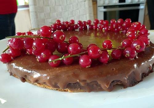 Melt all the ingredients for the filling in a saucepan on low heat, and pour on top of the completely cooled cake. Place in the freezer to set for at least a few hours, or over night. Let it thaw before serving though, or it will be very hard to cut through.