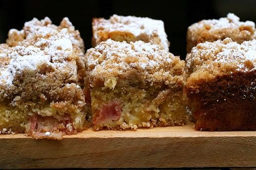 5. Using your fingers, break topping mixture into big crumbs, about 1/2 inch to 3/4 inch in size. They do not have to be uniform, but make sure most are around that size. Sprinkle over cake. Bake cake until a toothpick inserted into center comes out clean of batter (it might be moist from rhubarb), 45 to 55 minutes. Cool completely before serving.