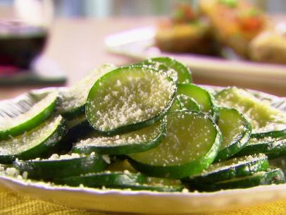 Heat the olive oil in a medium skillet over medium heat. When hot, add the garlic and saute for 2 minutes, or until fragrant; don't let it brown. Add the squash, salt and pepper and cook until the squash is tender but still slightly crisp, about 5 minutes. Transfer the squash to a serving dish and sprinkle with the parmesan cheese.