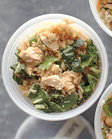 Combine rice, bok choy, cilantro, and sesame seeds in a bowl; toss in chicken with juices. Refrigerate until ready to serve. Serve with lime wedges.