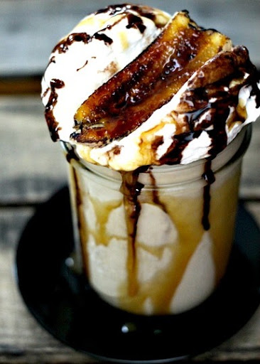 Take 2 pint jars, or similarly sized glasses, and drizzle some of the caramel sauce around the inside rim. Let it drip down before dividing the milkshake between the two cups. Top each glass with a generous cap of whipped cream then drizzle a little more caramel sauce and some chocolate sauce on top. Nestle a bruleed banana half in the whipped cream and serve immediately! Leftovers can be poured into popsicle molds for wonderful banana cream popsicles.