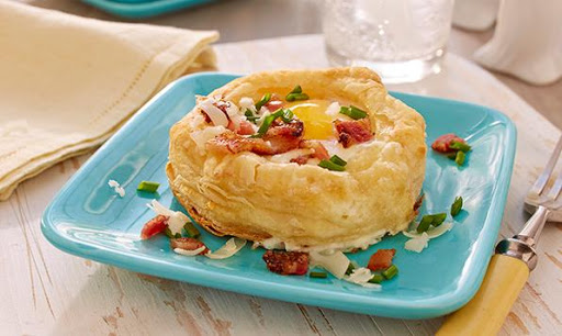 ARRANGE patty shells on a baking sheet. Bake in preheated oven for 15 minutes or until pastries are puffed and golden. Remove the centers from each patty shell and place 1 tsp (5 mL) of grated cheese in each one. Carefully crack an egg into each patty and return to the oven. Bake for 15 minutes or until eggs are set.