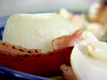 Peel and wash the onions. With the point of a small, sharp knife, cut a 1-inch core from the top of each onion and make shallow slits in a circle around the top. Wrap 2 slices of bacon horizontally around each onion, and secure them with toothpicks. Then put 1 teaspoon of butter in each core. Season with salt and pepper.