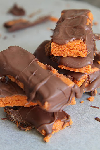 Melt candy corn in microwave on high 1 minute. Stir and continue cooking in 15-second intervals til melted, stirring after each interval. Stir in peanut butter. Spread mixture in an 8x8 pan lined with parchment. Cool completely. Cut into squares. Dip in melted chocolate. Lay on waxed paper to set.