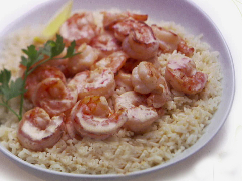 Using a fork, fluff the rice and arrange on a platter. Spoon the shrimp cream sauce over the rice and serve.