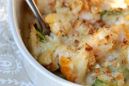 Pour 1/3 of the sauce on the bottom of an 8 by 11 by 2-inch baking dish. Place the drained cauliflower and brussels sprouts on top and then spread the rest of the sauce evenly on top. Combine the bread crumbs with the remaining 1/4 cup of Gruyere and sprinkle on top. Melt the remaining 2 tablespoons of butter and drizzle over the gratin. Sprinkle with salt and pepper. Bake for 25 to 30 minutes, until the top is browned.
