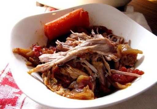 Return the pork to the pot. Cover and put in the oven for 3 1/2 to 4 hours, checking once or twice, until the meat is extremely tender and pulls away from the bone easily. Shred the pork in the pot, using tongs to separate the meat from the fat (see photos above). Discard the bone or set aside for another use.