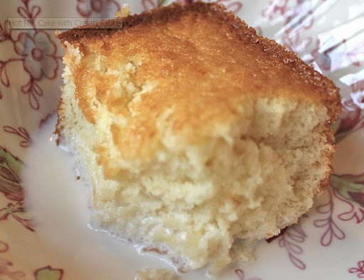 Butter an 8″ square or round cake pan. Prepare milk and butter. Whisk eggs well in a med. bowl. Gradually whisk in sugar and beat well. Stir in 1/2 c. flour, the baking powder, salt, and vanilla. Stir in other 1/2 c. flour, then the hot milk/butter. Pour into cake pan; bake 40-45 min. Pour the chilled sauce into a dish and put a slice of cake on top. Enjoy.