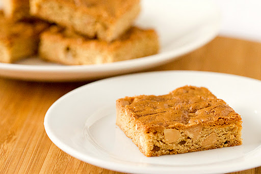 4. Scrape the batter into the prepared pan and smooth the top. Bake until a toothpick inserted into the center comes out with a few moist crumbs attached, 30 to 35 minutes, rotating the pan halfway through baking. Cool completely on a wire rack for at least 2 hours. Using the foil overhang, lift the blondies from the pan and transfer to a cutting board. Cut into squares. Store in an airtight container at room temperature.