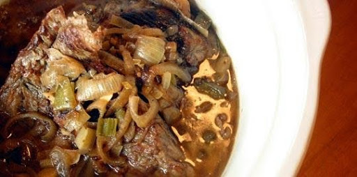Add a little more olive oil to the pan and heat over low medium heat. Slice the onions into thin half moons and saute gently until they are soft and lightly caramelized. Add the minced garlic and cook until tender and fragrant. Add to the slow cooker insert, tucking under and around the meat.