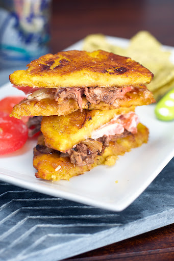 To build your jibarito, spread a little bit of spicy mayo on 1 tostone (fried plantain) then top with onions and steak. Place 2 tomato slices on top then the other tostone.