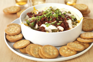 TOP with layers of sour cream, salsa and onions. Serve with crackers.