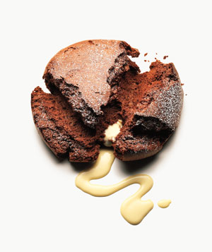 In 3 additions, fold the egg whites into the chocolate mixture. Pour into the prepared dish and bake until puffed and cracked