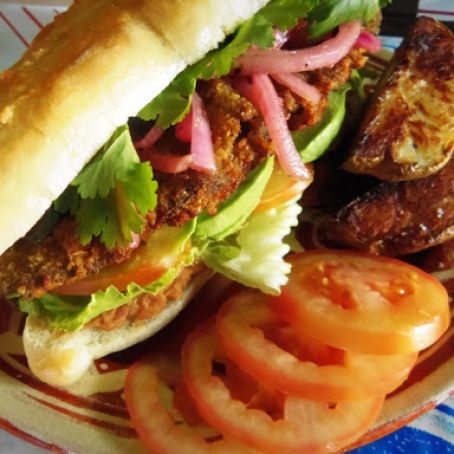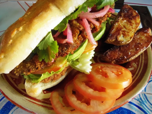 5. Slice the milanesa in half so you have 6 equal pieces.To the roll, spread with refried beans, lettuce, tomato, avocado, beef milanesa, onions and salsa. Serve with crispy potato wedges.
