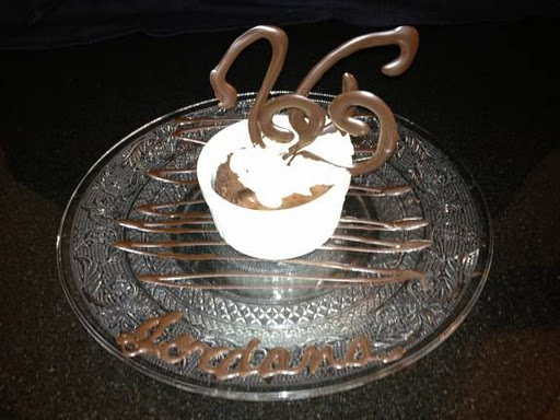 With the remaining chocolate wave the squeeze bottle back and forth to decorate the plate and write the name of each guest on the bottom portion of the dessert plate, let set.