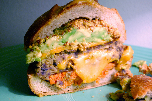 In a frying pan (greased with olive oil) over medium-high heat, fry the burgers until golden brown. We also covered ours at points so we’d be sure the cheese would melt.