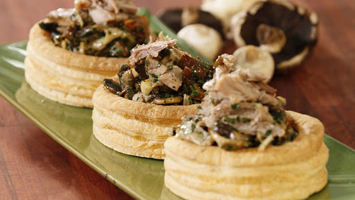 Incorporate half of the shredded duck meat to the mushroom mixture. Fill the vol au vents with the mushroom and duck.