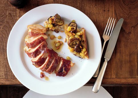 Prosciutto-Wrapped Chicken Breasts with Eggplant Panzanella and Raisin-Pine Nut Vinaigrette