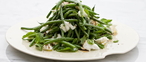 3. Tear the cheese into large pieces and scatter them over the green beans. Add the mint and toss again. Mound the mixture on a platter. Drizzle with the vinegar and serve.