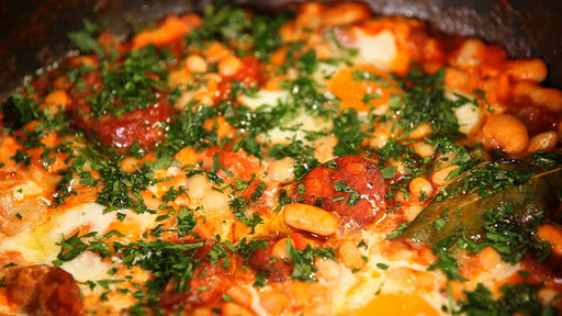 Distribute the cooked beans in 4 earth ware dishes. Using the back of a spoon make 2 indents into the beans. Crack the eggs into cavity. Season with salt and pepper and bake in the oven for about 8 minutes or until the eggs have set. Garnish with freshly chopped parsley.