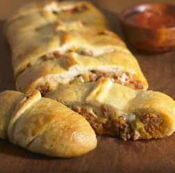 Spoon meat mixture evenly on top of sauce. Sprinkle cheese evenly over meat mixture. Pull up each long edge over filling and pinch edges together to seal. Pinch short ends together to seal.