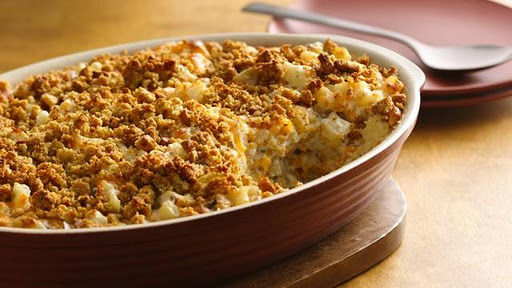 1 Heat oven to 350°F. Spray 13x9-inch (3-quart) glass baking dish with cooking spray. In small bowl, mix 1/4 cup of the melted butter and the crushed croutons; set aside. 2 In large bowl, mix remaining 1/4 cup melted butter and all remaining ingredients. Spoon into baking dish, spreading evenly. 3 Bake 40 minutes or until browned and bubbly around edges. Sprinkle crouton mixture over potato mixture; bake 10 to 15 minutes longer or until topping is browned. .If the chive-and-onion sour cream potato topper isn't available, you can use regular sour cream plus about 2 tablespoons chopped green onions instead..