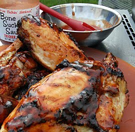 Place the chicken breasts, skin down, over the direct heat section of your grill, close the lid, and cook for 3 or 4 minutes or until nicely seared. Turn and sear the other side for 3 to 4 minutes. Move the chicken breasts to the indirect area, cut your burners to medium, and close the lid. You want to maintain about a 325°F temperature. Grill-roast for about 45 minutes or until an instant-read thermometer reads 170°F in the thickest portion of the breast. During the last 5 minutes glaze the chicken breast with your choice of sauce on the skin side only. Remove the breasts from the grill to a platter and let rest for about 5 minutes. Serve.