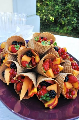 Clean and slice the fruit. Fill the waffle cones with the prepared fruit. Assemble to please the eye.