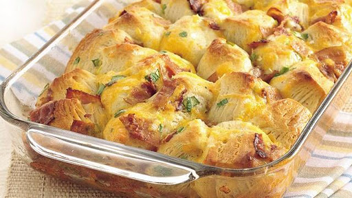 Heat oven to 350°F. Spray 11x7- or 12x8-inch (2-quart) glass baking dish with cooking spray. In large bowl, beat egg and milk with wire whisk until smooth. 2 Separate dough into 8 biscuits; cut each into quarters. Gently stir biscuit pieces into egg mixture to coat evenly. Fold in bacon, cheese and onions. Spoon mixture into sprayed dish; arrange biscuit pieces in single layer. 3 Bake at 350°F. for 23 to 28 minutes or until golden brown. Cut into squares.
