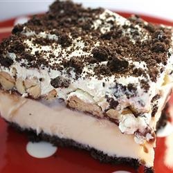 In a large bowl, mix together crushed chocolate sandwich cookies and 1/2 cup melted butter. Press onto the bottom of a 9x13 inch pan; freeze until firm. Spread softened ice cream over crust, then freeze until firm. Spread top with cooled fudge sauce, and sprinkle with peanuts; freeze until firm. Spread with whipped topping, and freeze until firm, or overnight.