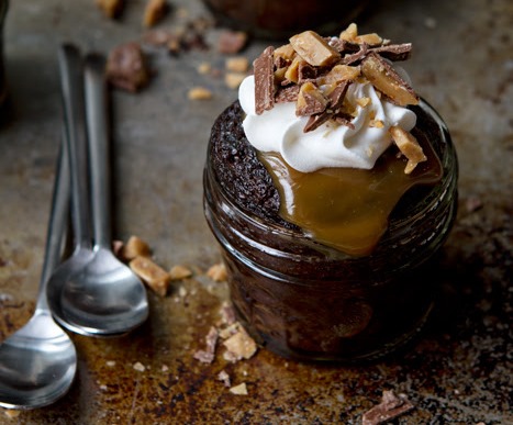 6. Once cakes have cooled for 5 minutes, use a wooden skewer to poke holes in the top of each cake. Spoon 2 teaspoons of caramel over the top of the warm cakes, allowing it to trickle into the holes. If desired, top each cake with whipped cream and Heath candy bar bits.
