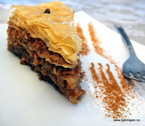 Sprinkle a layer of filling over the area of phyllo. Repeat each layer (4 sheets of phyllo) followed by equal amounts of nut filling (5 phyllo sheets bottom + 4 sheets X 3 layers + 4-5 sheets of phyllo for top layer).