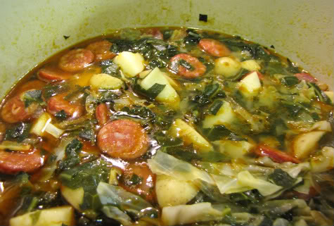Add sausage to the soup, and then add the kale. (*Cabbage can be added with the kale.) Simmer for 5 minutes.