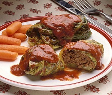 Spoon a scant 1/4 cup of the meat mixture onto each cabbage leaf, fold in sides. Roll up leaf, forming a bundle. Arrange rolls in a 2 quart rectangular baking dish.